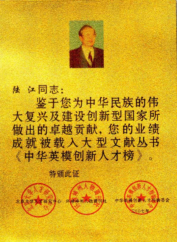 陸江的杰出貢獻被人民日報社評為先進個人